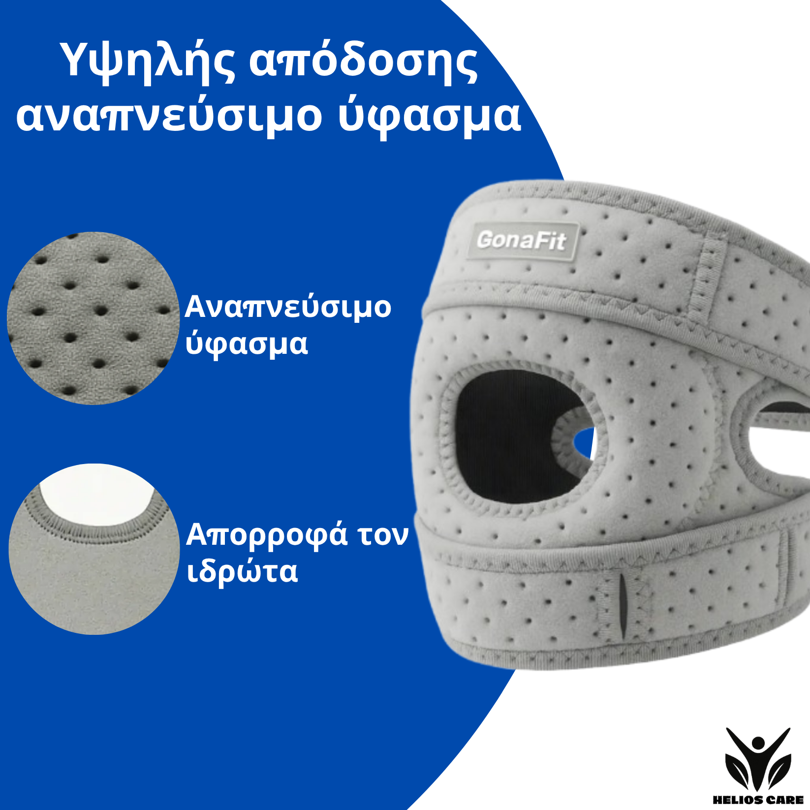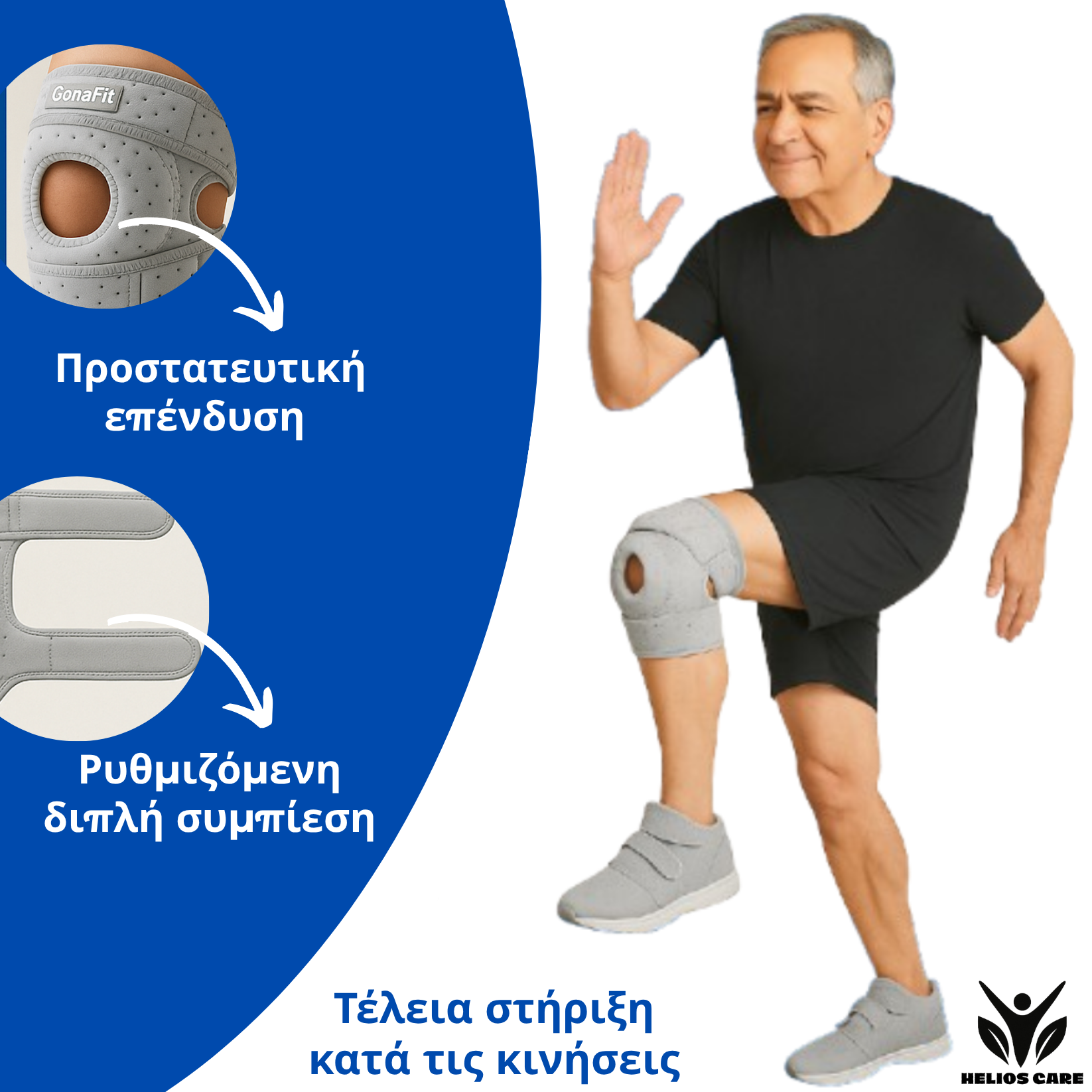Ο GonaFit σταθεροποιεί την επιγονατίδα, μειώνει την πίεση και προσφέρει άμεση ανακούφιση από τον πόνο στα γόνατα.